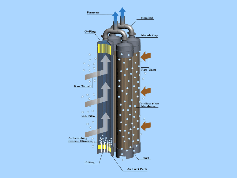 浸沒式系列產品采用 TIPS 法制備的 PVDF 中空纖維超濾膜,具有大通量、高強度,耐藥洗等特點,全開放設計,減少了污染物沉積,進水濁度范圍更寬;組件系統整體浸沒于過濾水體中,曝氣集水一體化,省卻了復雜的管路及支架,使安裝維護省時省力;集成化專利技術裝備,降低了膜池占地面積,其單套處理能力在市場同類產品中最高。